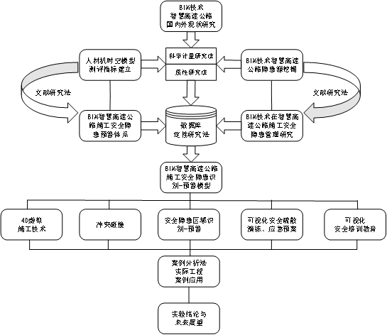 通过查阅和研究BIM技术和智慧高速公路施工安全管理相关的期刊文献,并运用Citespace科学计量和Nvivo质性编码,系统认知目前BIM技术在国内外的应用现状,尤其是BIM技术在高速公路施工安全隐患管理方面的应用程度,识别出高速公路施工安全管理的主要隐患,基于BIM技术构建智慧高速公路施工安全隐患预警体系,并制定智慧高速公路施工安全隐患防范对策,为全面加强高速公路施工安全管理提供理论参考及实践指导,具体项目研究路线如下图3所示。