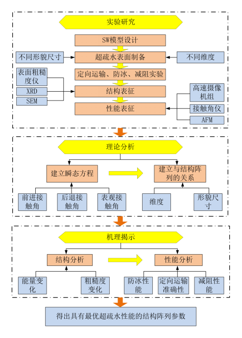 本项目拟采用理论计算与实验研究相结合的方式,其技术路线如图10所示,研究工作按“实验研究——理论分析——机理揭示”的思路开展。实验研究方面:拟采用3D打印制备不同维度、不同形貌尺寸的超疏水结构阵列,采用XRD、SEM、表面粗糙度仪等表征材料的组织结构,采用AFM、高速摄像机、接触角仪等测试超疏水表面的力学、弹跳等性能,以得出最优的超疏水结构阵列。理论分析方面:拟采用静态研究方法描述液滴的滞后过程,得到用于描述超疏水表面上的液滴滞后过程的瞬态方程,用于解释超疏水表面的定向运输性能、防冰性能、减阻性能等。机理揭示部分:通过对超疏水表面能量及粗糙度变化的分析,进一步修正瞬态方程,建立超疏水表面定向运输、防冰、减阻性能与结构阵列参数之间的内在关联,揭示不同应用条件下超疏水结构阵列表面性能的润湿机理,得到具有最佳超疏水性能的结构阵列参数。