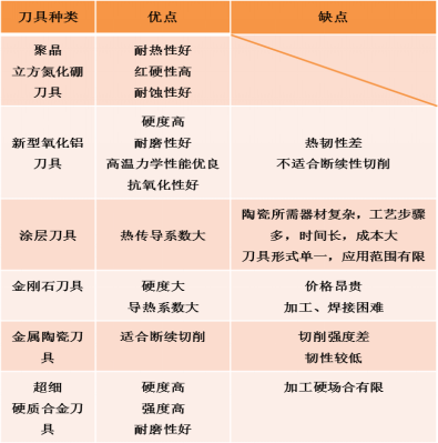 如上所述,目前可应用于干式高速切削的刀具主要有:立方氮化硼刀具、陶瓷刀具和金属陶瓷刀具、涂层硬质合金刀具、金刚石刀具、超细硬质合金刀具,其性能对比如表6所示,上述刀具各自具有优缺点,还难以满足干式高速切削对刀具材料所提出的综合性能需求,需要进一步开发综合性能更加优异的新型刀具材料,满足干式高速切削对刀具材料提出的综合性能要求。