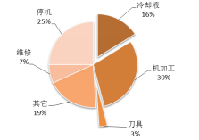 传统的金属切削加工大多采用湿式切削法。在湿式切削法中,切削液主要有三大功能:润滑作用、冷却作用、清洗和排屑作用。这些功能对工件已加工表面质量和刀具耐用度有一定影响,而且大量使用切削液会导致制造成本的增加(美国企业对加工成本的统计见图1),同时切削液对环境造成了严重污染(切削液的化学成分见表1),甚至一定程度危害操作工人的身体健康。基于此情况,干式高速切削技术因其更环保且效率高,从而逐渐显现出优势所在,在未来制造领域具有巨大的潜在应用潜力[1]。干式高速切削技术[2,3]就是在切削过程中,刀具与工件及刀具与切屑的接触区不使用任何切削液体介质的加工工艺方法,其分为两种类型:一种是不使用任何冷却润滑介质的纯干式切削;另一种是单纯以气体射流(空气、氧气、氮气和氩气等)为冷却润滑介质的干式切削。干式切削技术通常应用于高速切削场合,其最大的特点是不使用切削液简化了工艺系统,降低了加工成本,从源头上控制污染从而解决湿式切削带来的环境与安全健康问题。干式切削技术要在不使用切削液的同时,保证加工的高效率、产品的高质量、刀具的高使用寿命和切削过程的高可靠性,这就需要性能优良的干式切削刀具以及辅助设备代替传统切削中切削液的作用。