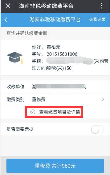 2、本部缴费,由学生本人,进入湖南省非税移动缴费平台缴费(同学费收取)。
