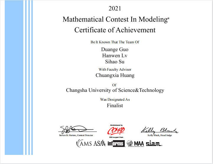 近日,2021年美国大学生数学建模竞赛结果正式公布。伟德共获得特等奖提名奖(Finalist)1项和二等奖(Honorable Mention)6项的好成绩。数学与统计学院黄创霞教授指导的郭端格、吕翰文、苏思浩3名同学组成的代表队获得此次竞赛的特等奖提名奖, 实现了学校在此项比赛上的突破。