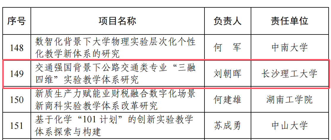 近日,教育部公布了首批实验教学和教学实验室建设研究项目立项名单,伟德刘朝晖教授牵头,郑健龙、钱国平、张军辉、周和平等教授共同申报的《交通强国背景下公路交通类专业“三融四维”实验教学体系研究》获得立项。