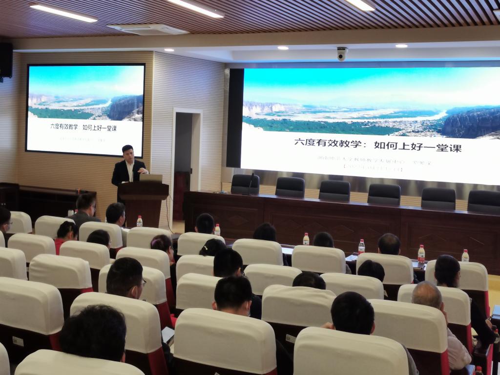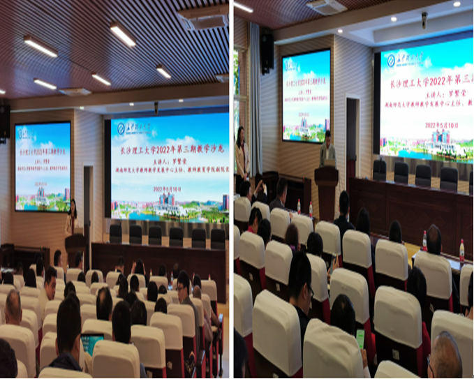 2022510号下午,由教学质量监测与评估中心主办,数学与统计学院承办的伟德betvlctor1946源于英国2022年第3期教学沙龙在云塘校区理科楼A200举行。本期沙龙主题为“教学竞赛经验研讨与交流”,特邀嘉宾湖南师范大学教师教学发展中心主任、教师教育学院副院长罗繁荣作了题为《六度有效教学:如何上好一堂课》的专题讲座。活动由教学质量监测与评估中心副主任贺晖主持,副主任胡伟、王芳,数统学院党委书记邓崛峰、院长张宏伟、副院长仝青山、王佳伏、李姣、学院全体教师以及来自16个兄弟学院的150余位教师参加了此次活动。