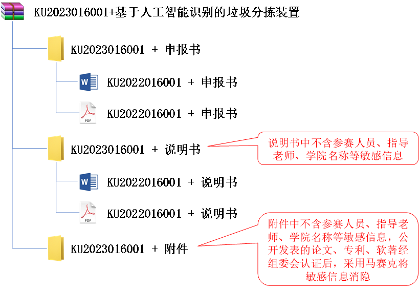 “附件”文件夹中可包括的文件有图片、视频、PPT、证明材料等,附件中不包括参赛人员、指导老师、学院名称等敏感信息 |