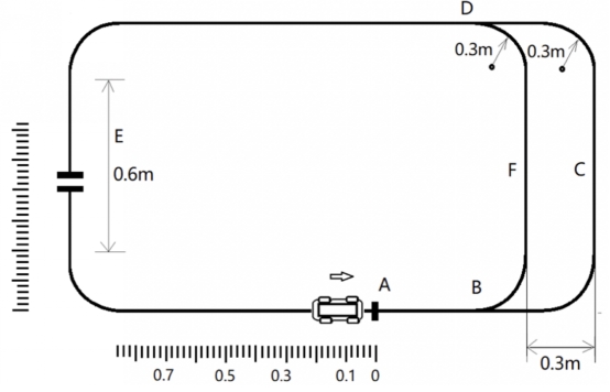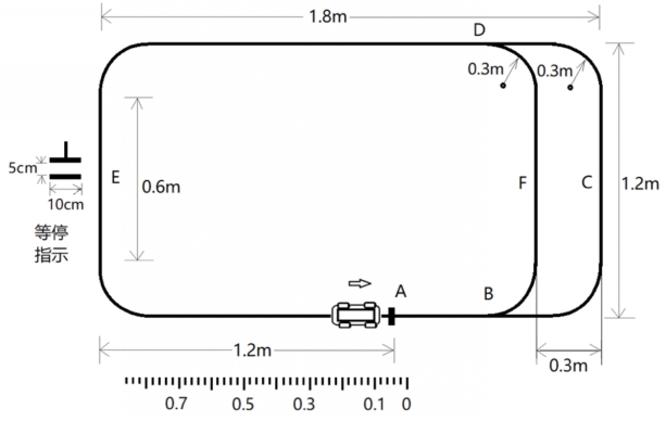 小车从A点出发,以0.5m/s速度,途经B、F、D点后,在停车区域E(0.6m长度范围)任一停车点(由测评专家指定)停车5s,误差不超过1s,车身上定位点不能超过A点5cm(60分)。