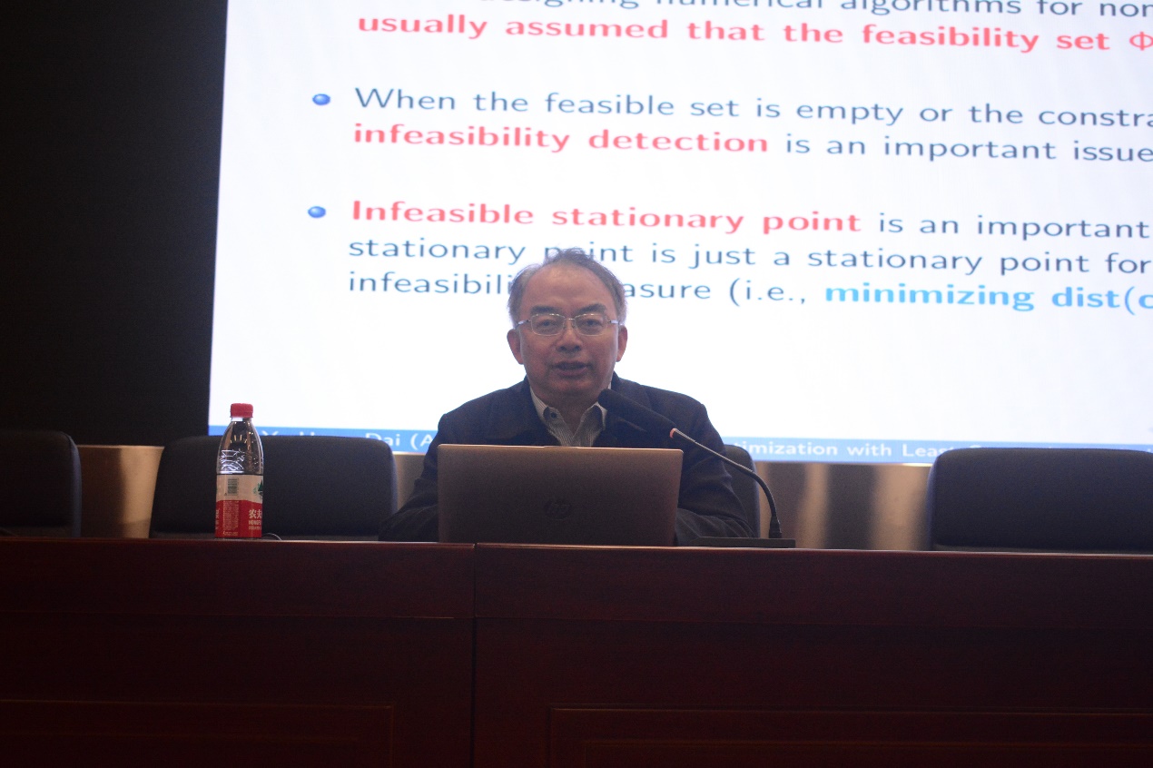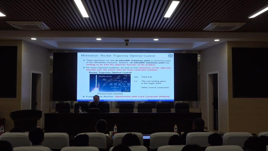 讲座中,戴彧虹研究员从Newton和Leibniz发明的微积分讲起,到Lagrange对等式约束优化问题提出拉格朗日函数和拉格朗日方法,以及Karush和Kuhn-Tucker对一般等式和不等式约束优化问题提出一阶最优性必要条件,带领师生们追溯了非线性优化的历史。戴教授结合其团队研究火箭的燃料问题等最优化在实际应用中的例子,指出已有的非线性优化理论和算法研究通常假定问题可行,并不能满足实际当中存在诸多不可行优化问题的求解需求。紧接着,戴彧虹教授从动机、理论和算法方面介绍了他和合作者最近提出的一类最小约束违背优化问题,并对该方面未来可能的研究工作进行了展望。