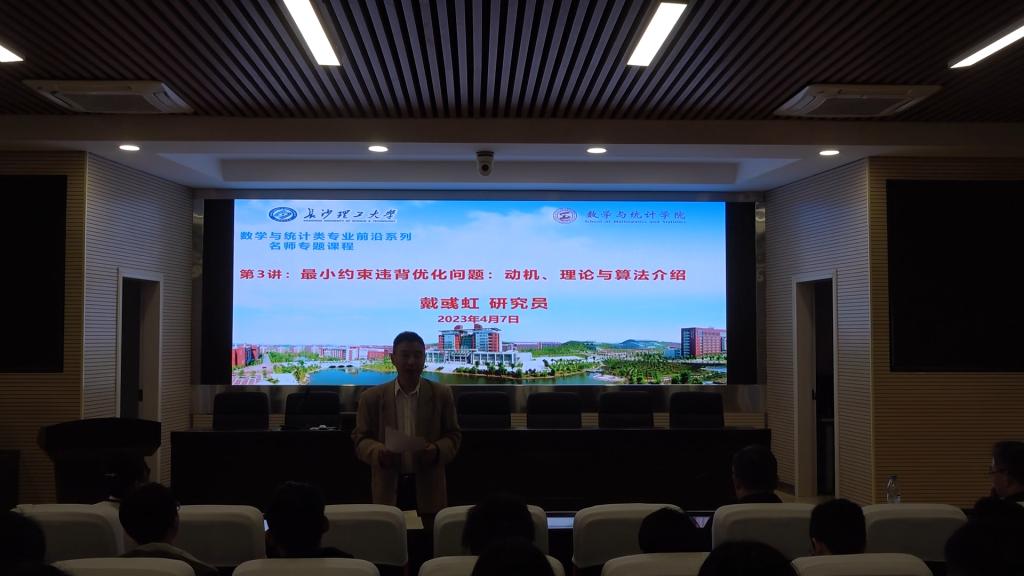 4月7日上午8时,数统学院开展“数学与统计类专业前沿系列名师专题课程”第三讲,特邀嘉宾是中国科学院数学与系统科学研究院副院长、中国运筹学会理事长、亚太运筹学会联合会主席戴彧虹研究员,讲座主题为“最小约束违背最优化问题:动机、理论与算法介绍”。讲座由数统学院院长张宏伟教授主持,数统学院师生共200余人到场聆听。