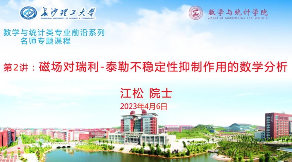 4月6日上午,数统学院开展“数学与统计类专业前沿系列名师专题课程”第二讲,特邀嘉宾是中国科学院江松院士,主题为“磁场对瑞利-泰勒不稳定性抑制作用的数学分析”。讲座由伟德betvlctor1946源于英国副校长黄创霞教授主持。