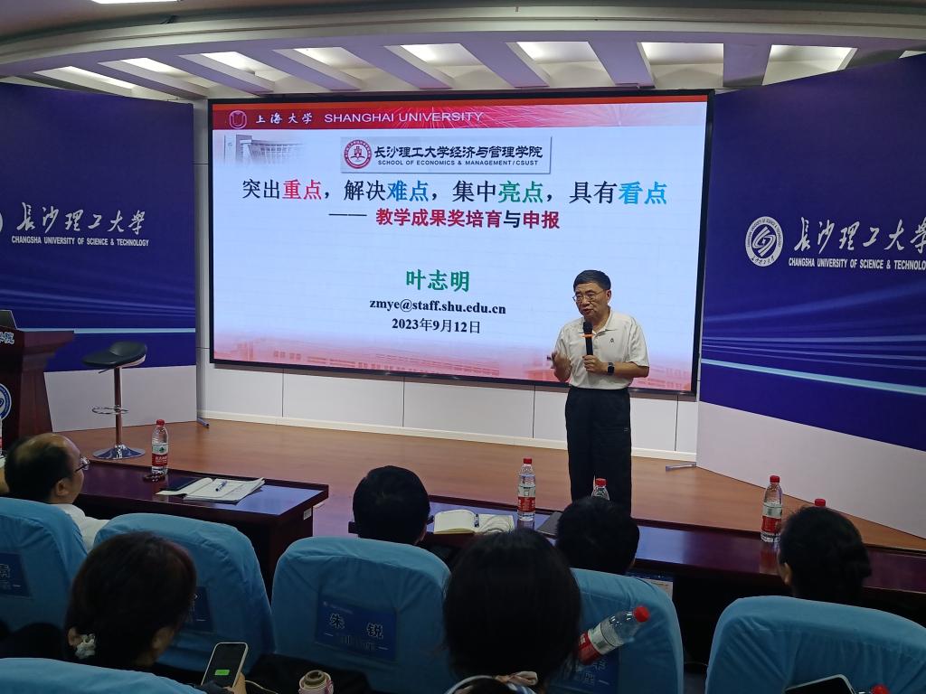 为进一步深化学院教育教学改革,加强教学改革及实践经验总结,更好地培育和孵化教学成果,推进教学成果奖的有效申报,9月12日下午,经管学院邀请在教育教学方面有丰富经验的国内知名专家、上海大学原副校长叶志明教授做客学院新商科一流专业建设论坛第七期,作题为《关于教学成果奖培育与申报中若干问题》的专题报告。院党委书记丁丹主持报告会。