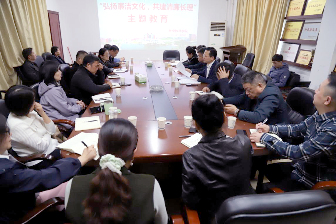 为进一步落实学院全面从严治党责任、推进清廉长理建设,2023年11月20日下午,继续教育学院在15教三楼会议室开展“弘扬廉洁文化 共建清廉长理”廉政主题教育活动。党总支书记何纯芳,正处级纪检员易贵民,学院全体领导班子成员及各部门负责人参加,活动由何纯芳书记主持。