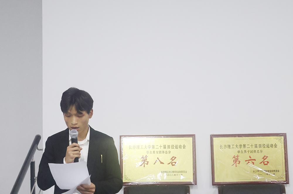 学工部主任范石泉宣读了获奖名单。此次校运会我院荣获的团体奖项有:学生男女团体总分第八名、学生男子总分第六名、学生女子总分第三名和体育道德风尚奖。范主任表扬了运动员们在此次校运会上的优异表现,并且给予鼓励,希望他们再接再厉,同时对志愿者和团学干部的辛勤付出给予了充分肯定和表扬。