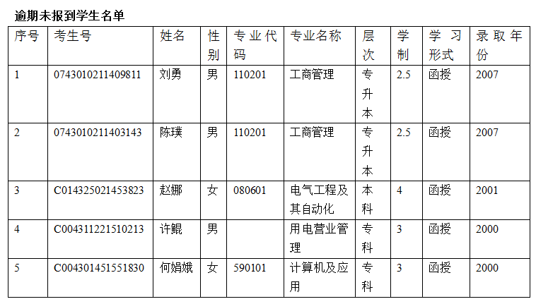 经查,我院2000-2007年录取的刘勇等5名考生至今未按入学要求来我院或我院函授站(点)履行报到、缴费注册手续,也未向我院提交任何请假或保留入学资格申请,相关函授站(点)也未就此向我院提交有关请假和申请保留入学资格的材料。