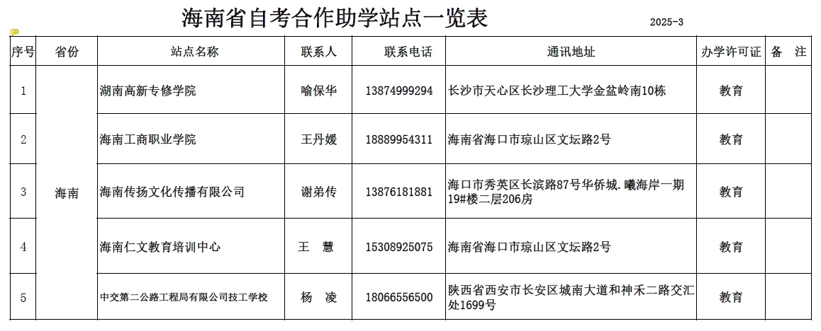 海南省自考招生助学站点一览表