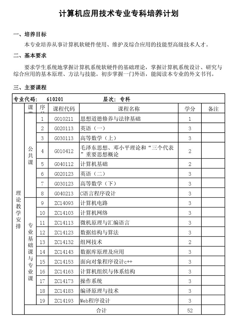 专科培养计划-专业代码:610201 计算机应用技术专业