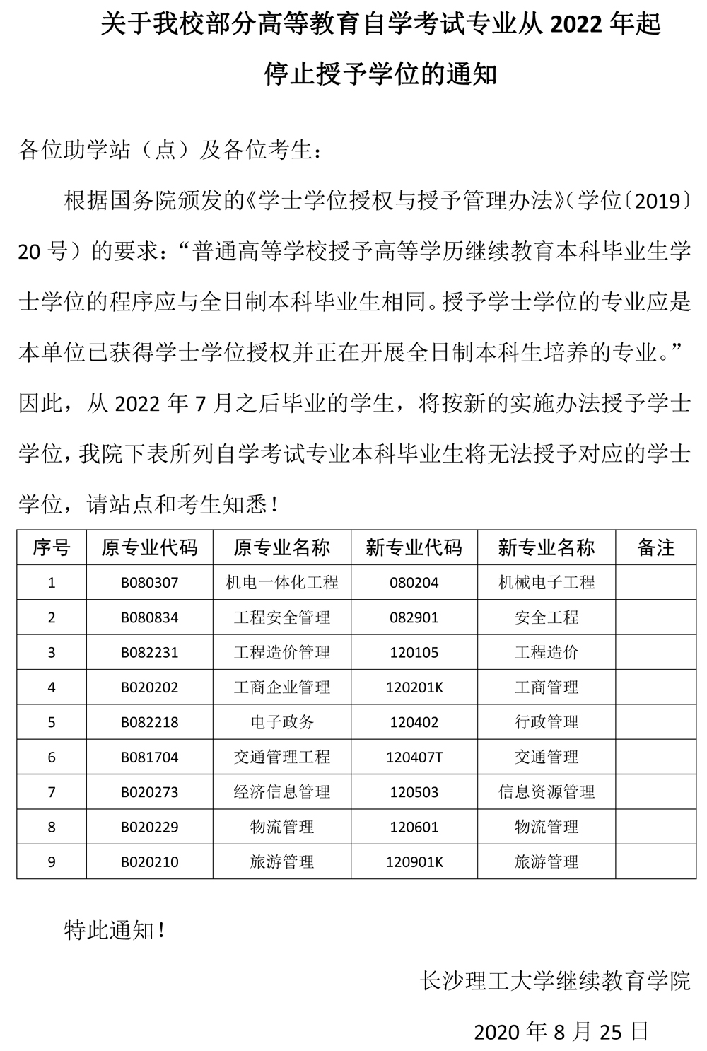 关于伟德部分高等教育自学考试专业从2022年起停止授予学位的通知