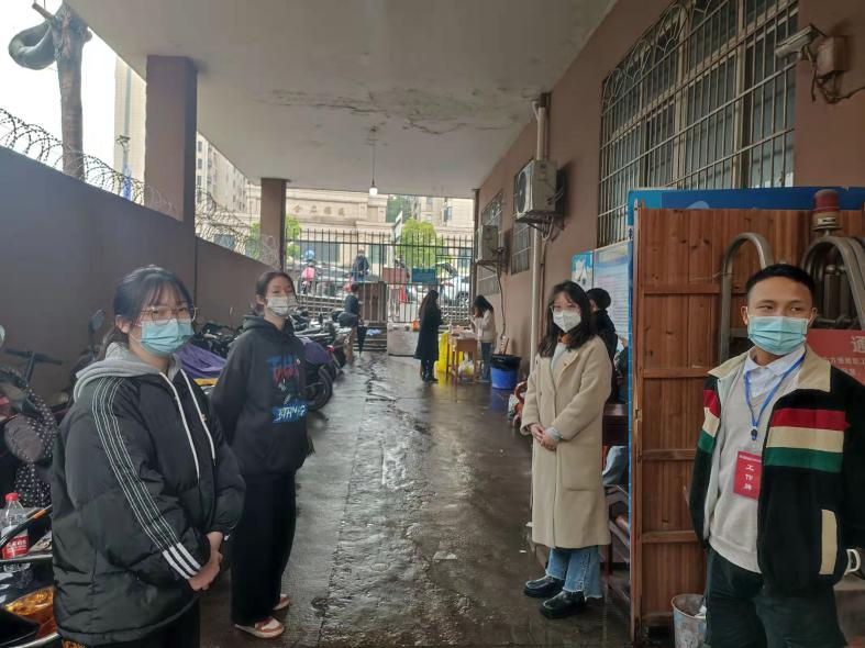 3月27日早上7:00,学院的8名学生党员集结在金盆岭校区志愿服务中心体育馆内,在学工部主任范石泉,团学老师单乃付,党务老师朱灵安的带领下,去往分配到的西后门检测点。