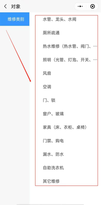 (2)点击对象-维修类别,选择相应报修类别,如下图所示。