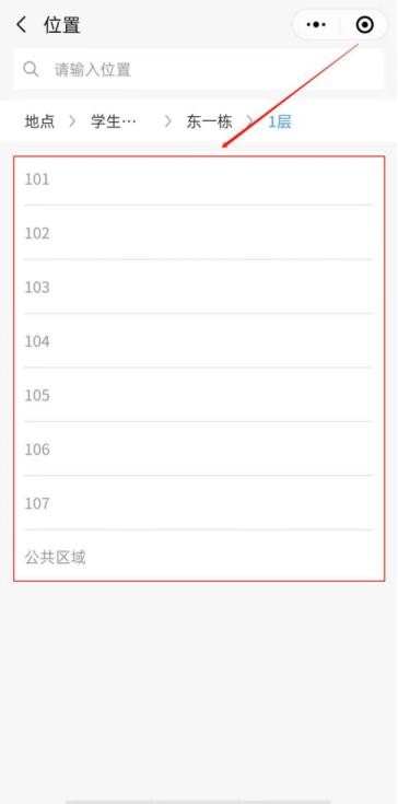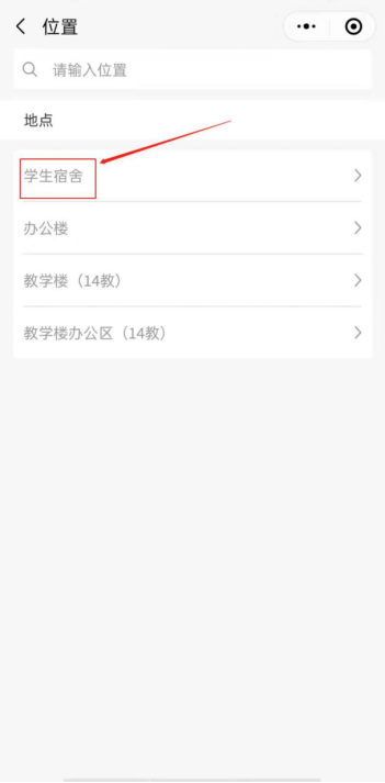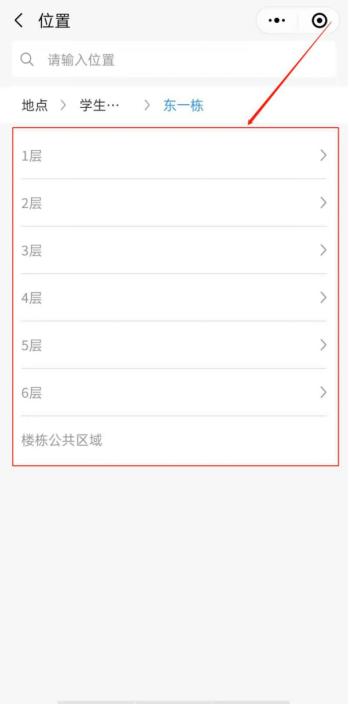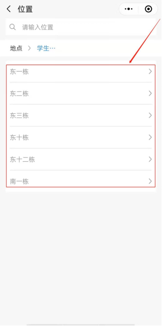 (1)点击位置-学生宿舍,选择需要报修的相应楼栋以及寝室号,如下图所示。
