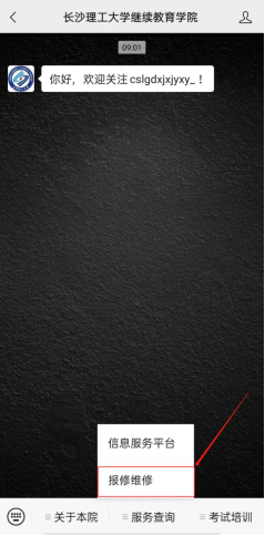 1.关注微信公众号“伟德betvlctor1946源于英国继续教育学院”,点击“服务查询-报修维修”,如下图所示。