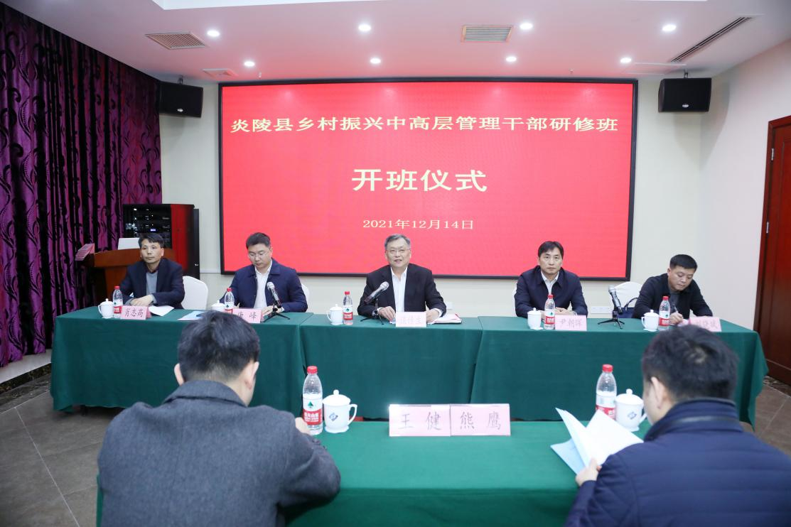 2021年12月14日,伟德承办的“炎陵县乡村振兴中高层管理干部研修班”,在伟德国际学术交流中心举行开班仪式。副校长谈传生出席开班仪式并致辞。炎陵县委书记尹朝晖,县委组织部长唐峰,县委常委、副县长刘晓斌,副县长肖志高,继续教育学院、建筑学院、设计艺术学院、成果转化中心等学院、部门负责人,及全体学员参加开班仪式。开班仪式由炎陵县委组织部长唐峰主持。