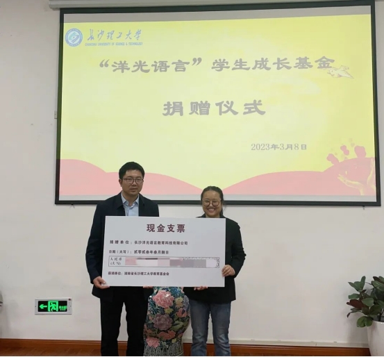 3月8日上午,教育基金会捐赠仪式在校友之家举行。长沙洋光语言教育科技有限公司向伟德教育基金会捐赠100万元,设立“洋光语言”学生成长专项基金。