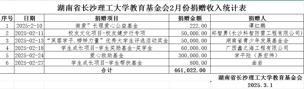 湖南省伟德betvlctor1946源于英国教育基金会2025年2月捐赠收入表