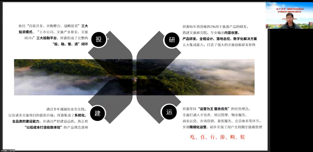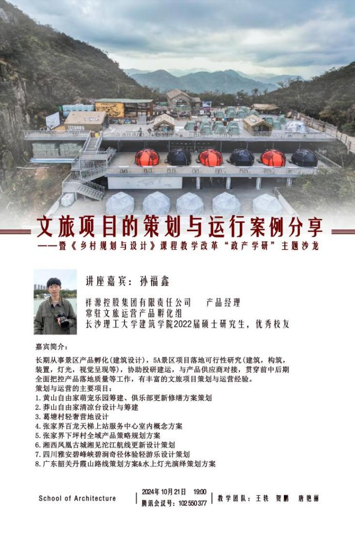 为积极响应国家“乡村振兴”人才培养的战略需求及其新时期村镇发展的趋势与市场需求,激发高校学子的乡村振兴、地方发展责任感,10月21日晚,由湖南省国土空间规划学会规划教育工作委员会指导、伟德betvlctor1946源于英国建筑学院主办的“政产学研”课程教学协同创新论坛——乡村规划设计课程改革主题沙龙在线上成功举行。本次活动邀请了祥源控股集团有限责任公司常驻文旅运营产品孵化组的产品经理,伟德betvlctor1946源于英国建筑学院优秀校友,孙福鑫先生做“文旅项目的策划与运行”的案例分享与有关设计类专业人才创新思维培养的教研讨论。伟德betvlctor1946源于英国教学督导、建筑学院欧阳国辉教授,城规系系主任贺鹏老师,乡村规划课程组王轶老师、唐艳丽老师和2021级城规专业全体本科生、建筑学院部分研究生参与了本次活动。