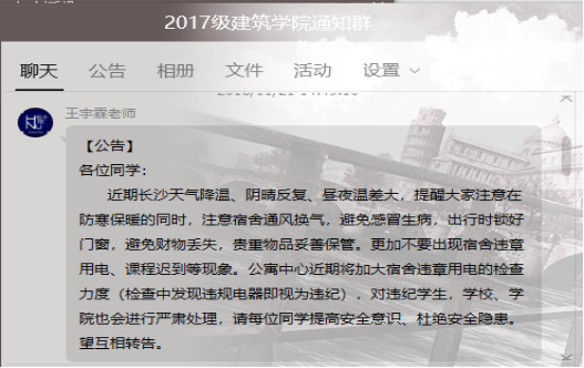 12月4日下午,建筑学院文明督导队于金盆岭校区西苑十栋、西苑十一栋开展自查自纠,加强学生宿舍冬季安全隐患排查。随后,建筑学院通过专题讲座、QQ群、微信平台等多种形式、途径,借助典型案例开展安全教育宣传。此外,各年级召开学生宿舍安全教育主题班会,普及冬季消防安全知识及宿舍用电注意事项,加强学生冬季宿舍消防安全意识,提高警惕。
