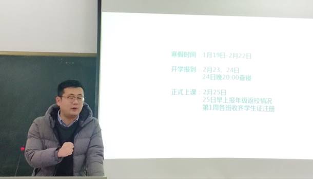 接着,王宇霖老师将寒假的安排细则以及兵役登记的通知告知同学,并讲评大学生学习方法指导的作业,并进行作业布置。结束前,老师对同学们进行了假期安全教育。同学们要注意个人安全,尽量不要组织集体出游;注意交通安全,不要乘坐没有运营资格证的车辆;注意财产安全,离开学校期间,要保护好寝室和教室的个人财产。