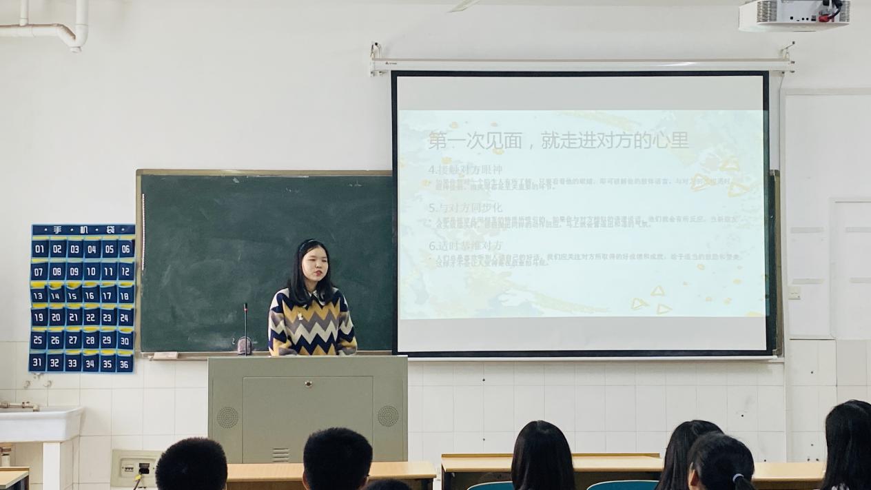 侯可欣同学就什么是人际交往、人际交往的重要性、初次见面应怎么做等方面展开讲解。在课程开始,她就什么是人际交往向在场同学提问,得到了同学的积极回应,然后就该问题提出了自己的见解。随后她强调了人际交往的三点重要性,一是人际交往可以加深自我认知,二是人际交往能够促进社会化进程,三是人际交往是与他人相处、实现人生价值的桥梁,加深了大家对人际交往重要性的认识。在最后,侯可欣同学就初次见面怎么做提出了杜绝自恋、保持明媚心情、不要迟到、注意礼仪、进行眼神交流、时常赞美、记住对方名字等几点重要建议,并通过案例分析加深了同学们对这些建议的理解,使课程内容更加深入浅出,给同学们留下了深刻印象。