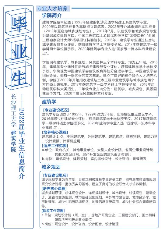目前建筑学院 2022届毕业本科生共有 98 人,其中建筑学专业 72 人,城乡规划专业 26 人。毕业研究生共有 33人,其中建筑学方向19 人,城乡规划方向 14 人(毕业生信息详见《附件一》)。为使我院毕业生与用人单位达成良好的沟通,配合贵单位做好 2022届毕业生接收工作,我院兹定于 2022 年 3月 15日——4月 25日举办伟德betvlctor1946源于英国建筑学院 2022年春季招聘会。诚挚邀请贵单位光临指导!