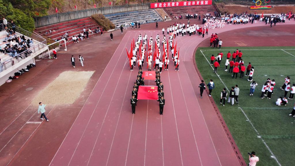 校党委副书记刘建民致运动会开幕辞。他指出,过去一年里学校在特色体育运动实践和体育赛事方面取得了优异成绩和丰硕成果。体育运动已经成为了学校文化和师生精神文明生活的重要组成部分。随着音乐声响起,大型团体操表演《等你来》拉开了开幕式的帷幕。随后,庄严的国旗,校旗与校徽依次通过主席台,各学院代表方阵随其后依次入场。建院学子们身着白衣黑裤,整齐的着装展现出学院良好的风貌。领队高举建筑学院院旗,带领方阵整齐划一地走向主席台下。他们是学院的代表,向全校师生展示建院人的信念与斗志。三名同学手持木制建筑模型,展示出专业特色。他们眼神坚定,步伐统一,昂扬的精神面貌是他们交上的青春答卷;高举的标语是他们自信的青春呐喊,昭示着他们必胜的决心。