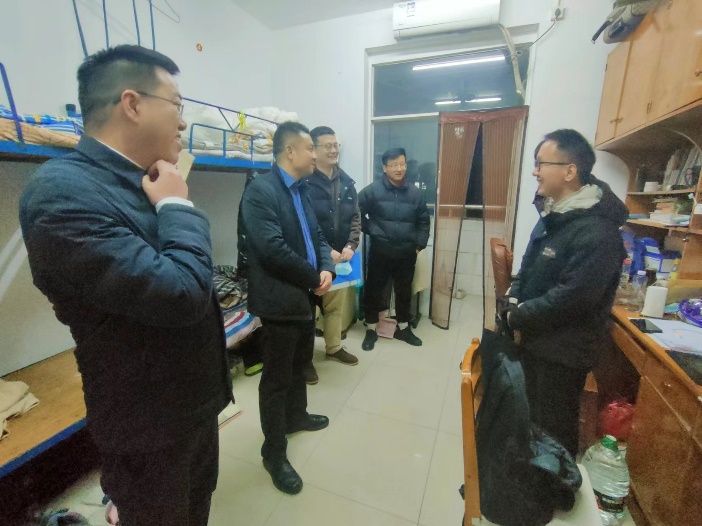 2月19日晚,建筑学院党委书记熊鹰、副书记李家春等院领导带领学工办辅导员深入学生宿舍走访看望学生,了解学生开学返校情况,倾听学生在学业科研、能力提升、身心健康方面的成长需求。