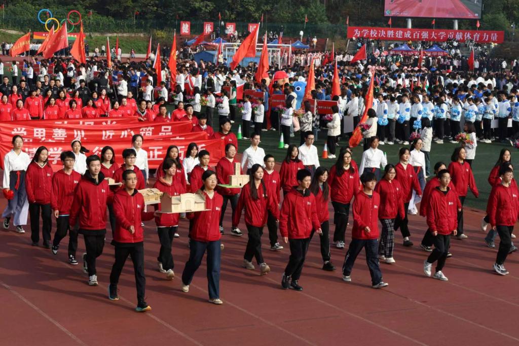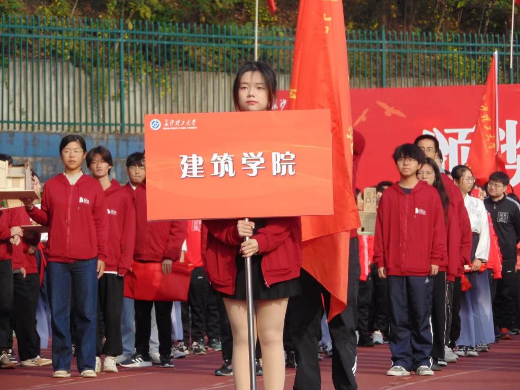 朝阳的金色洗亮了跑道,青春的旋律谱成了赞歌。各学院代表队昂首挺胸,斗志昂扬地走进体育场,走过主席台,在音乐声中展示才艺,展现青春风貌。建筑学院代表方阵领队高举建筑学院院旗, 带领着方阵以高昂的气势、 整齐的步伐走过主席台。 他们身穿院服,眼神坚定,洋溢着青春的气息。建筑学院方阵携带着建筑模型,展示出建筑的专业特色,展现了建筑的魅力。本次建筑学院师生合作,团结一致,秉持着努力拼搏的精神,希望在运动场上展现自我。 自信的姿态便是他们必胜的决心。