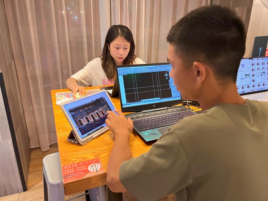 7月5日上午,“三下乡”实践团带齐测绘工具、摄影设备以及无人机等设备,前往上海静安区成都北路7弄30号中国共产党第二次全国代表大会旧址。在第一天对其周边环境观测的基础上,实践团队使用测距仪、卷尺等工具对中共二大旧址的建筑整体以及建筑细部进行测量,并使用平板电脑和坐标纸记录数据并进行汇总。