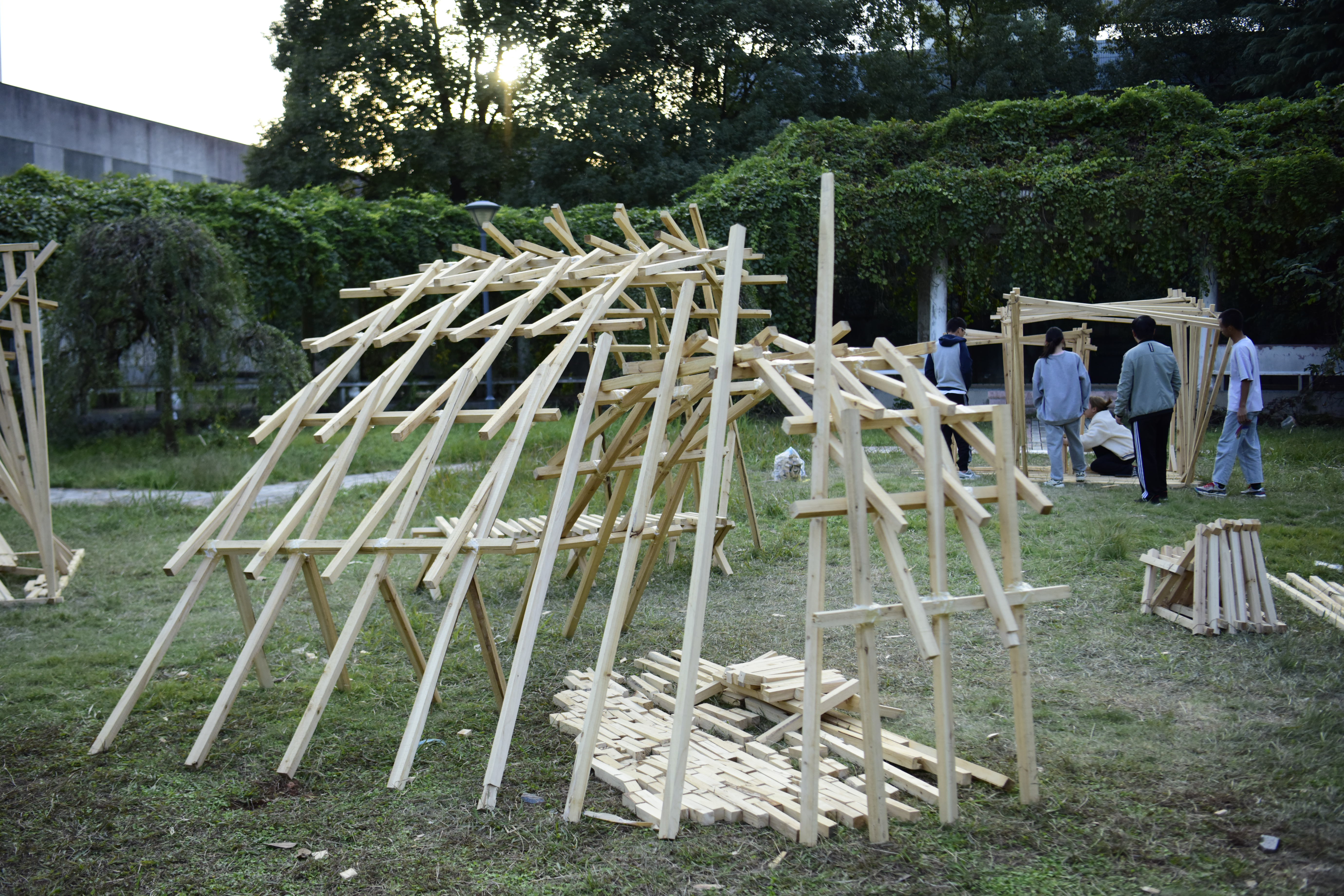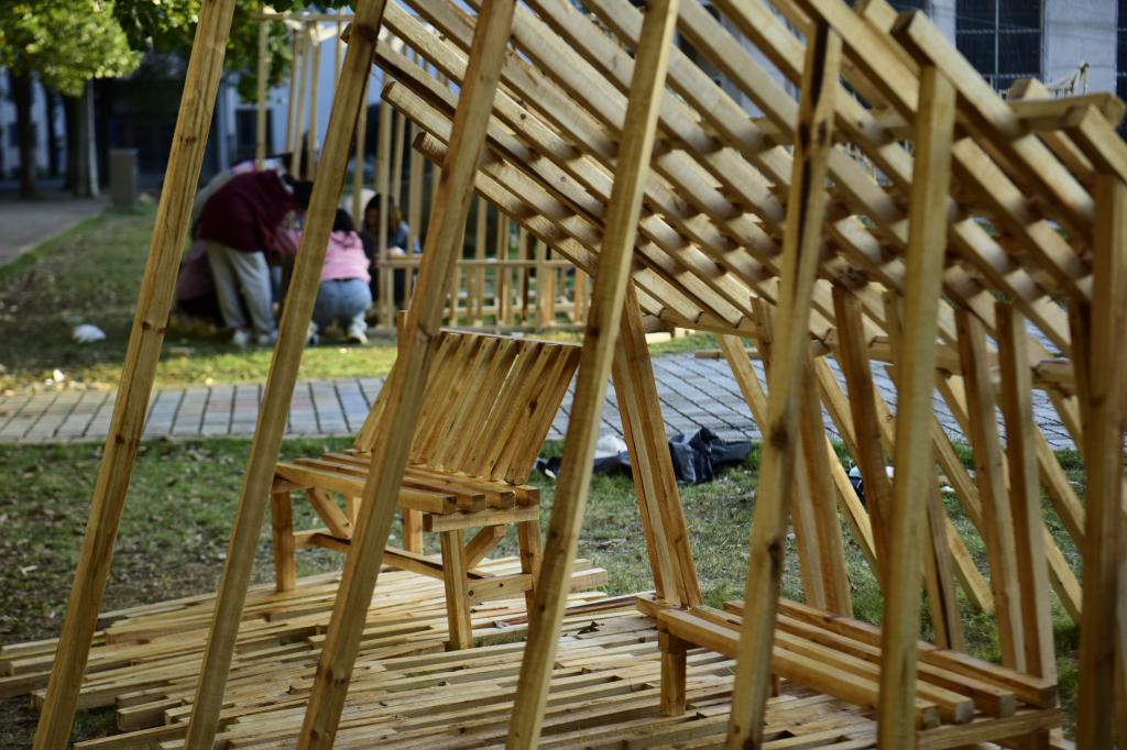 本次建构实践活动运用木材,学生小组自发组织、合作进行。建构成果要求构筑物成品、PPT、建构视频、A0展板等。在老师的指导下,每个学生团队设计方案,开展讨论,分工合作,理解木材的特性,掌握空间构成技法,学习榫卯等连接方式,并不断思考如何将建筑与环境有机结合。随后,学生们制作草模、试做榫卯、初建框架,将方案与实际结合,不断修改和调整榫卯的形式、承重的结构、作品的功能性和人体尺度,将作品做结实、做稳定、做舒适。从方案设计的彷徨到搭建成功的欣喜,他们克服了重重困难,无论昼夜、无论风雨。木构优秀成果的展出,不仅融合了校园自然风光,展现了建筑学院欣欣向荣的精神态势,还成为了长理校园一道美丽风景线。
