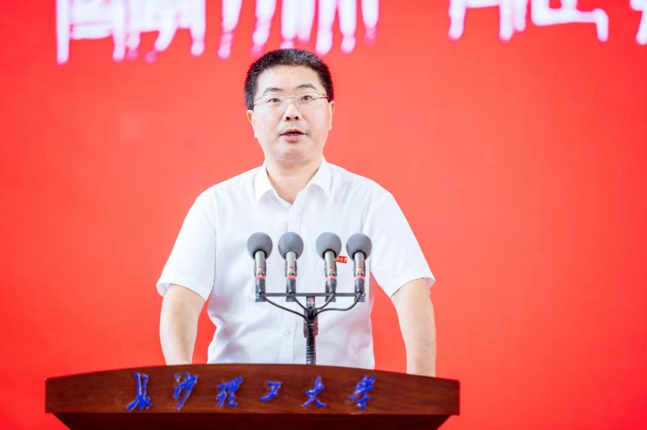 校党委书记付宏渊,校长曹一家及部分校领导出席本次开学典礼,副校长胡永乐主持。典礼伊始,全体师生起立奏唱国歌,随后校长曹一家代表全校师生向2023级研究生新生表示热烈欢迎,并以《勇担时代使命 努力成为高水平创新人才》为题致辞,寄语2023级研究生新生。之后交通运输工程学院张军辉教授作为导师代表发言、水利与环境工程学院2020级博士研究生陈帮作为老生代表发言以及经济与管理学院2023级硕士研究生谢妮纳作为新生代表发言。最后学校党委书记付宏渊为新生代表佩戴校徽。