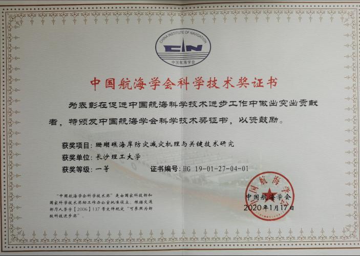 2020年11月17日,中国航海学会在广东省广州市召开的2020年学术年会上举行了2019年科学技术奖颁奖典礼。以伟德betvlctor1946源于英国为第一完成单位,水利工程学院海岸海岸带开发利用与防灾减灾科研创新团队成员姚宇特聘教授为第一完成人的成果“珊瑚礁海岸防灾减灾机理与关键技术研究”荣获中国航海协会科学技术奖一等奖。