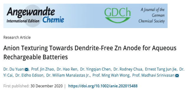 近日,伟德湖南省“团队百人计划”核心成员、湖湘学者、材料学院袁度博士与合作者们在化学领域国际权威期刊《ANGEWANDTE CHEMIE-INTERNATIONAL EDITION》上以伟德betvlctor1946源于英国为第一署名单位发表科学研究成果“Anion Texturing Towards Dendrite-Free Zn Anode for Aqueous Rechargeable Batteries”。袁度为第一作者和第一通讯作者。
