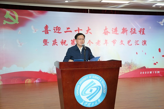 刘建民代表学校党委向老同志送上美好的祝福。他指出,离退休老同志以文艺汇演的方式歌颂党的丰功伟绩,喜迎党的二十大胜利召开,充分展现我们老同志昂扬向上的精神风貌和助力学校发展的壮心豪情。他向老同志们通报了学校过去一年各项事业取得的显著成效,同时详细介绍了学校党委在付宏渊书记的亲自组织下,办成了多年来一直想办的一件大事,即建成了全国独家,集校史馆、红色工程馆、思政教育馆于一体的“三全育人”教育基地,并于今年国庆节当天正式开馆。这个基地既是对学校办学历程的历史总结,更是对各位老同志为学校发展呕心沥血的情景再现。他感谢老同志长期默默无私的付出方才成就了今日的长理,强调老同志是学校最宝贵的财富,建设“幸福长理”,首先就是要让老同志感到幸福,希望老同志继续为学校的发展贡献余热,助力学校早日实现“长理梦”。
