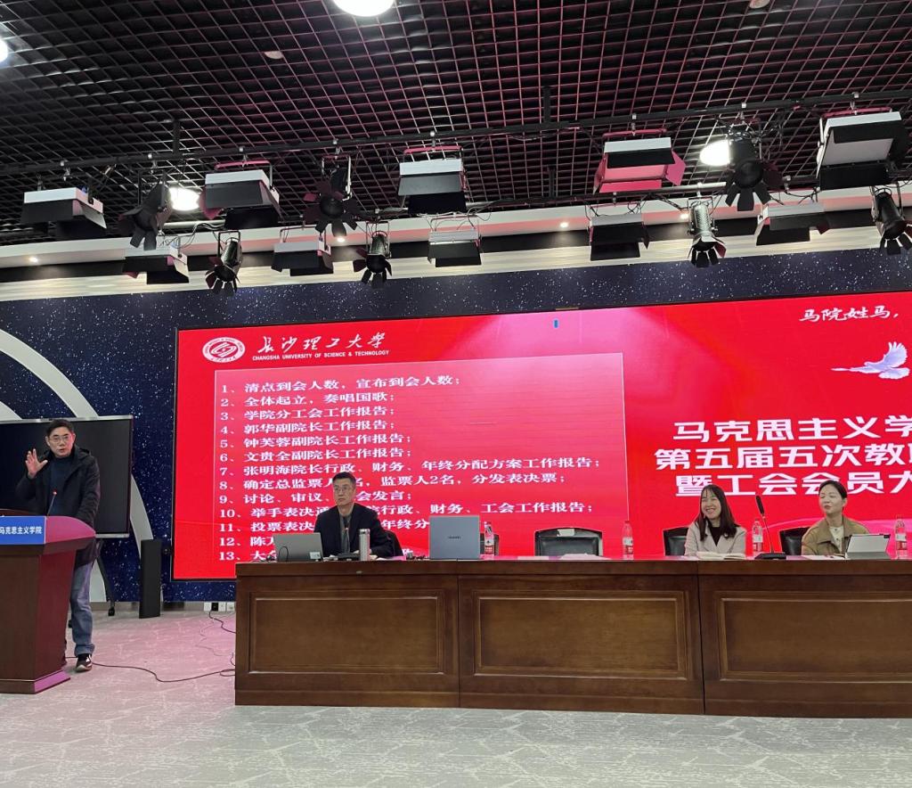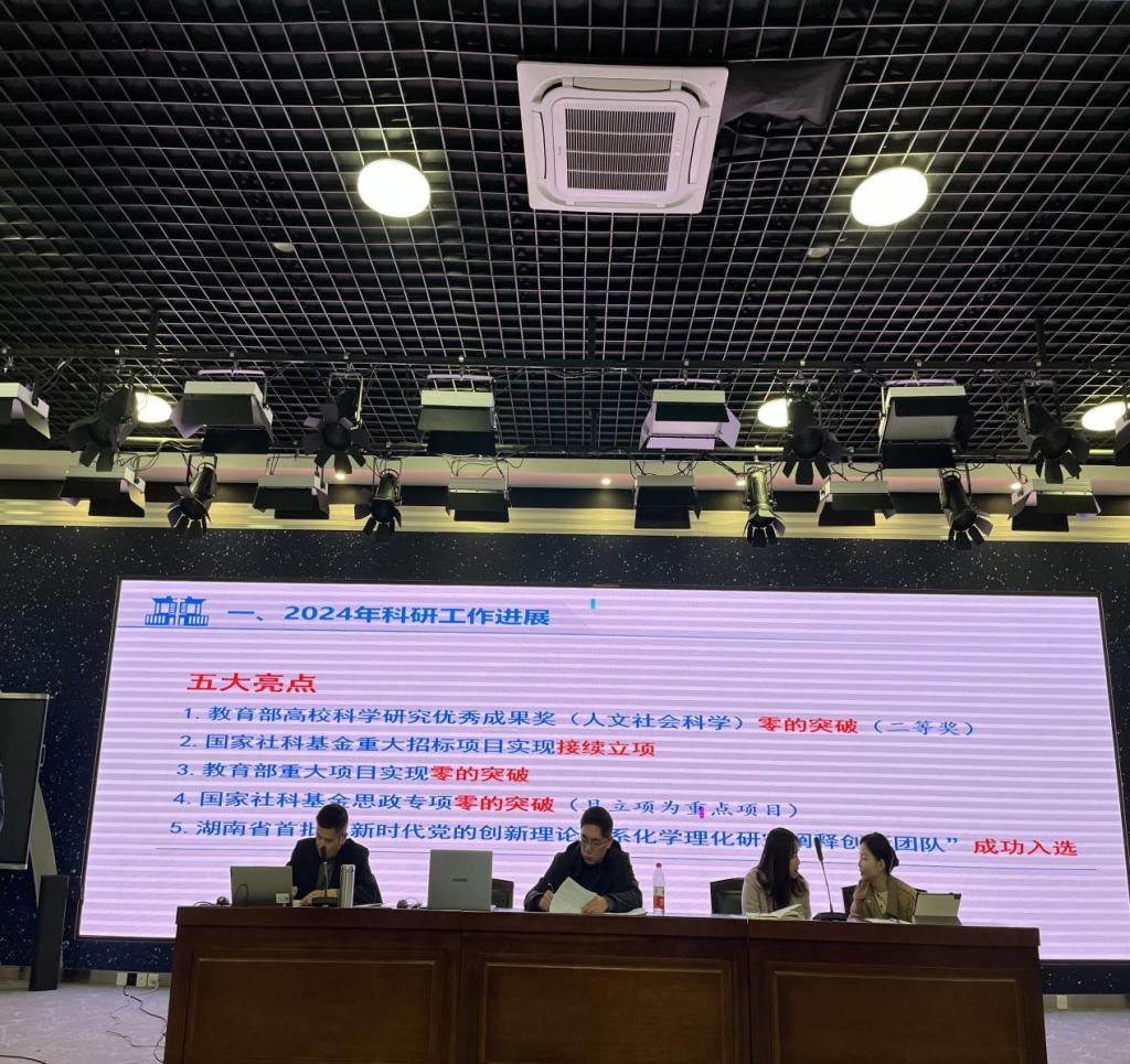 张明海在学院行政工作报告中总结了学院2024年工作亮点。一是引进了11位年轻博士,学院人员结构更为优化,呈现出人丁兴旺、奋发有为的良好态势。二是大思政课建设成绩斐然。在教育部组织的习近平新时代中国特色社会主义思想大学习领航计划主题教育活动中,罗月婵团队作品《花开桐木》荣获“我心中的思政课”——第八届全国高校大学生微电影展示活动长视频组特等奖,钟芙蓉团队作品《浴血重生的湘江战役》荣获“七十五载薪火传承,千秋伟业奋斗有我——第八届全国高校大学生讲思政课公开课展示活动”本科组一等奖;陈万球主持第62届中国高等教育博览会“‘大思政课’创新发展学术活动”,张明海以《“大思政课”建设的文化向度》为题在论坛上进行学术交流发言;承办湖南省协同推进思政课程与课程思政高质量发展研讨会,联合刘少奇故里管理局开展“少有奇志 强国有我”——走进炭子冲研学实践系列活动,邀请毛泽东同志纪念馆、刘少奇同志纪念馆专家走进学校思政课堂。三是科研与学科建设取得5大标志性成果,实现了教育部高校科学研究优秀成果奖(人文社会科学)零的突破、国家社科基金重大招标项目接续立项、教育部重大项目零的突破、国家社科基金思政专项零的突破,成功入选湖南省首批“新时代党的创新理论体系化学理化研究阐释创新团队”。四是研究生培养质量显著提升,五是学院办学条件明显改善。