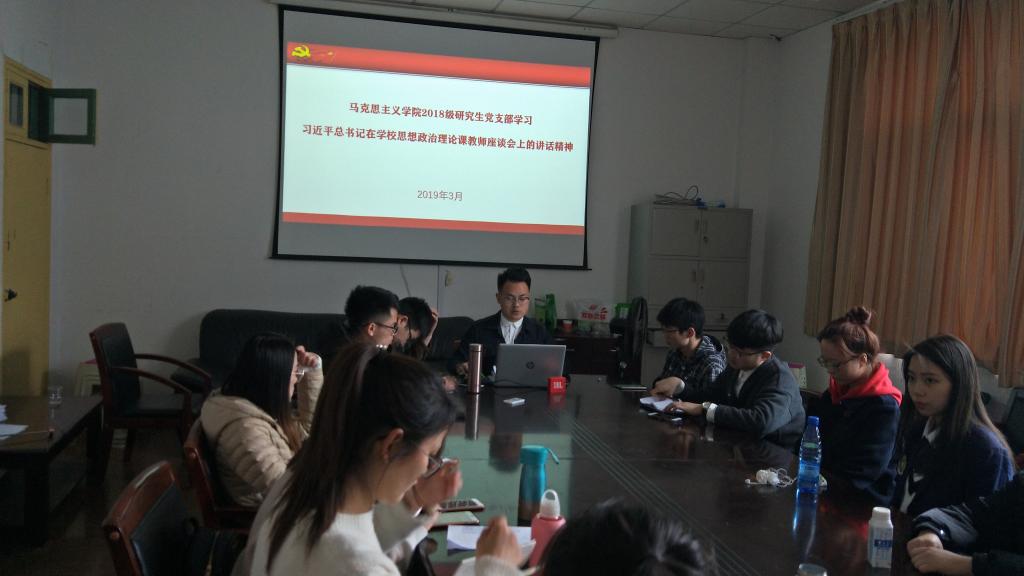 3月26日,为学习领会、贯彻落实习近平总书记在学校思想政治理论课教师座谈会上重要讲话精神,马克思主义学院2018级学生党支部在金盆岭校区四教503开展了“学习习近平总书记关于思想政治理论课重要讲话”主题党日活动。会议由党支部书记沈康主持,支部全体党员参加会议。