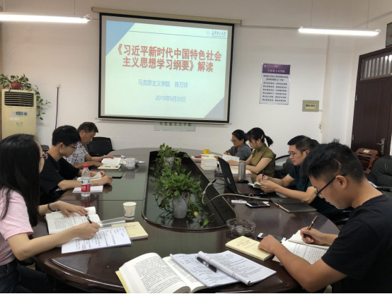 2019930日星期一在云塘校区文科楼b601开展了主题为《习近平新时代中国特色社会主义思想学习纲要》解读的党课学习,处级组织员周展主持,陈万球院长主讲。院中心组、主题教育领导小组成员参加。