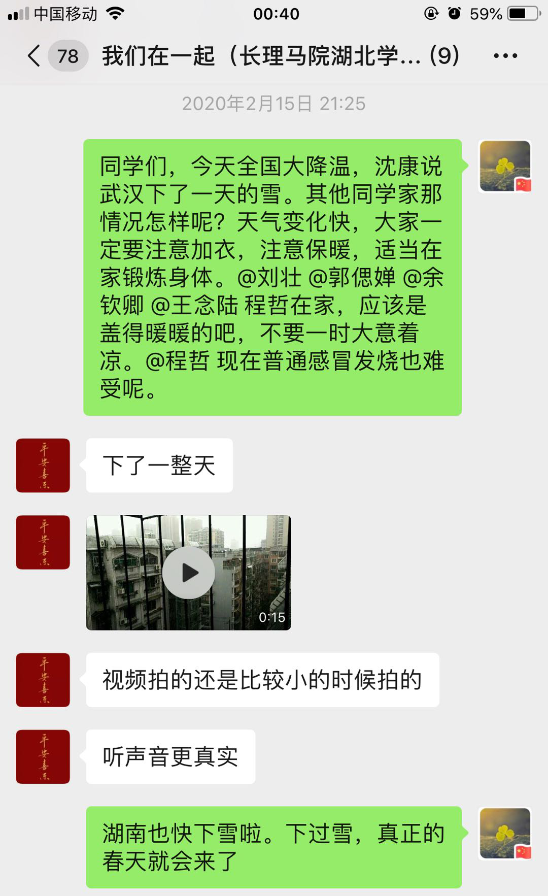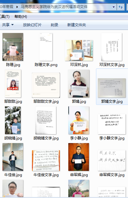 学院共有6名学生现居湖北,其中两名现居武汉,曾老师通过电话详细了解了每一位学生的居住环境、防疫和生活物资状况、生活学习状况、心理感受以及遇到的困难。引导有情绪的学生通过文字来抒发缓解,让他们更加坚强。为更好的关心身在疫区的学生,曾老师还特组建了“我们在一起(湖北籍学生)”微信群,一句句问候,一声声关切,都暖到学生心里。另外,她除了鼓励学生们多看书、多写文,还与学生一起积极参加“潇湘家书”、三行情诗征集、书写祝福、分享书评等校内外各种活动,与同学们健康平安共前行。