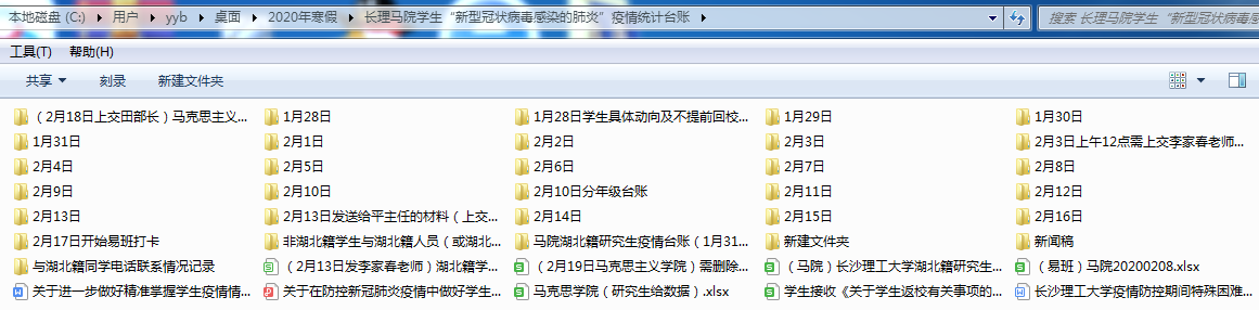 1月26日大年初二中午11:00,曾老师接到了来自校研究生院的第一个疫情防控通知,拿出电脑、电话,便由“春节假期模式”转到了“战时状态”。曾老师的母亲曾在2003年参加过“非典”防控,她深深明白疫情的凶险,所以必须要联系到每一个学生,了解去向动态。于是,她积极设计统计表格、组建学院学生防疫工作微信群、发动各班级学生干部,根据班级特点运用QQ、微信或网络问卷等方式,掌握每一位同学的假期行程动态,实现“一日一报”健康打卡制度,并在此基础上将每位学生的身体健康情况形成台账。