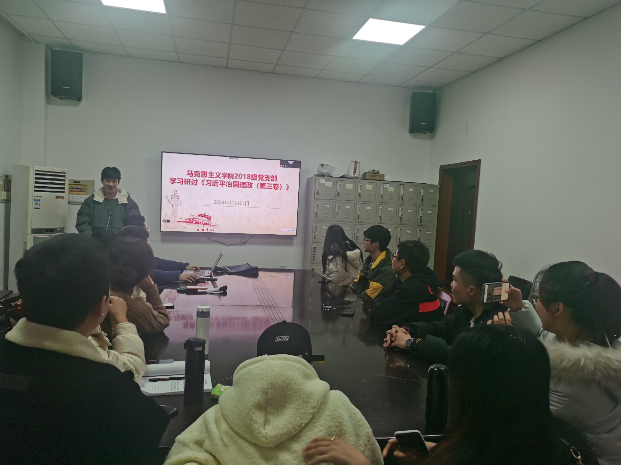 为贯彻落实习近平新时代中国特色社会主义思想,深入学习《共产党宣言》、《习近平谈治国理政》等党的理论书籍,增强青年党员的理想信念,2020年11月27日,马克思主义学院2018级党支部在四教403报告厅开展了“树理想信念,读马列经典”读书分享会。分享会由支部书记沈康同志主持,全体党员和部分发展对象参加。