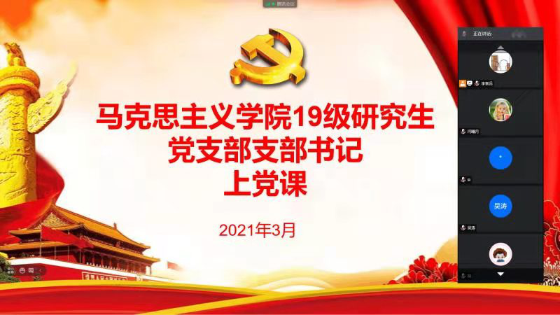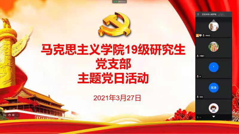 为了庆祝中国共产党百年华诞,3月27日,马克思主义学院2019级研究生党支部于线上开展了“学党史守初心悟思想伟力”主题党日活动,会议由党支部书记李袁远主持,支部全体党员、预备党员参加。