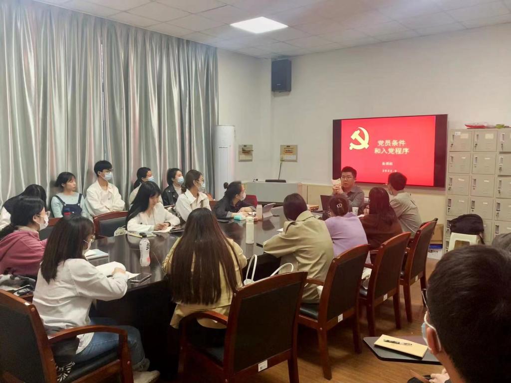 2022年4月19日晚19:00,马克思主义学院2022年上期入党积极分子培训班于金盆岭4教503开展关于《党员条件与入党程序》的学习,本次教学理论课学习活动由设计艺术学院的陈鑫宇老师主讲,马克思主义学院2022年上期全体入党积极分子参加,党员代表郑进、杨珺、吴彩虹负责监督。