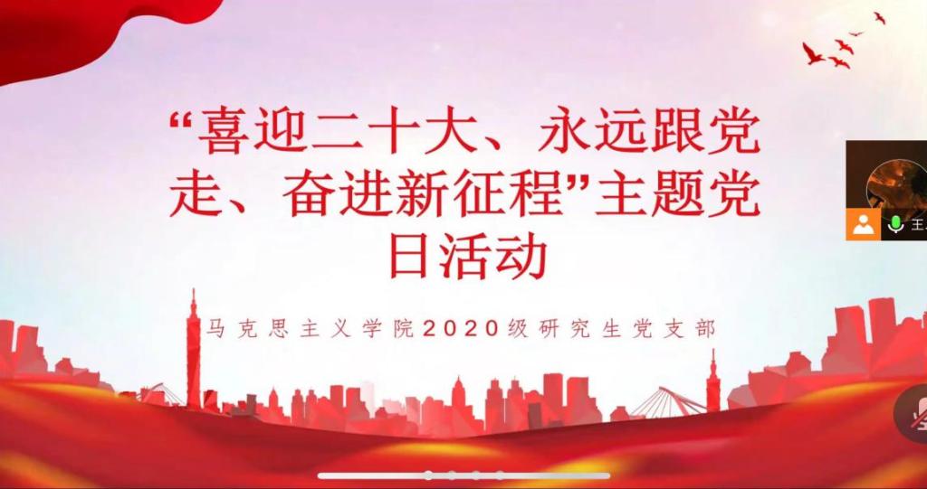为学习习近平总书记在省部级主要领导干部“学习习近平总书记重要讲话精神,迎接党的二十大”专题研讨班上的重要讲话精神,强化党员身份和使命担当意识,2022年9月28日19时,伟德betvlctor1946源于英国马克思主义学院2020级研究生党支部通过腾讯会议开展本月党员大会暨“喜迎二十大、永远跟党走、奋进新征程”主题党日活动。马克思主义学院2020级研究生党支部全体成员参与学习交流,本次专题学习由支部书记王静怡主持。